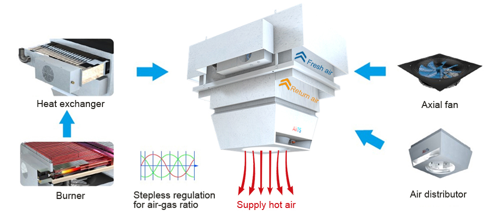 The heating unit is installed on the roof, inputting outdoor fresh air, which is solving the heating needs for high and large space (H:4-30m). Adopting direct combustion of gas in the gas coil to heat the air, with high heat exchange efficiency.