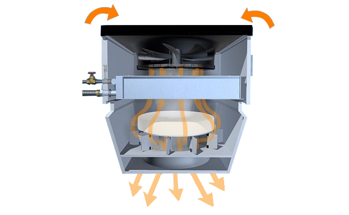 | Cold air stays at the top | Dual-pressure airflow delivers air directly to the ground |